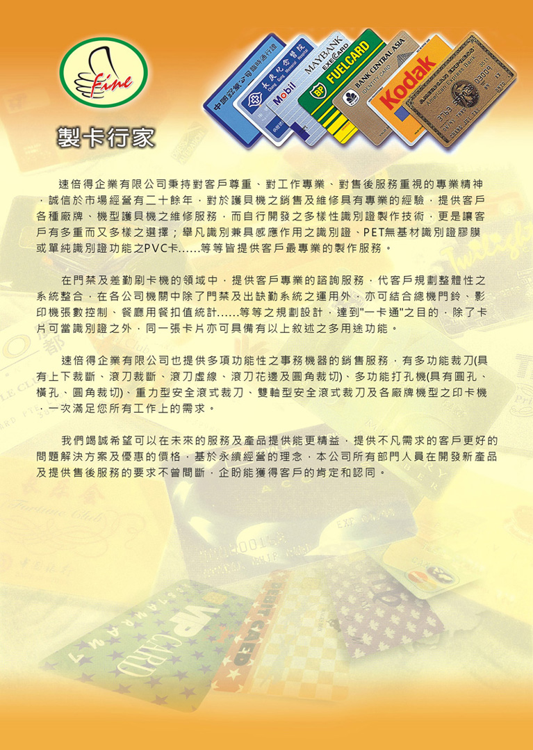 識別證印製/發卡設備銷售維護/感應卡片製作----會員卡、貴賓卡承製/IC製造系統整合/電腦刷卡系統 護貝機、護貝膠膜批售/無線膠裝系統/鋼圈膠環裝訂系統 桃園公司 334 桃園市八德區義勇街88巷47號(請從66巷入) TEL:03-3744726 FAX:03-3744725 行動:0910-251782 電腦週邊銷售維修--------印表機銷售維修--------軟硬體整合技術諮詢服務 台北公司 114 台北市內湖區民權東路六段64號3樓 TEL:02-87919377 FAX:02-87919380 行動:0910-187655 網頁最後更新時間: 2023-02-18 11:40 AM |